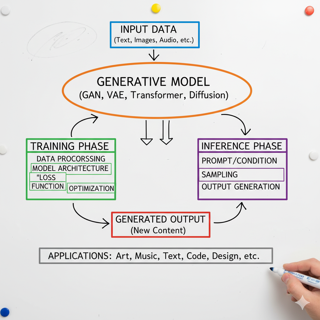 Think of generative AI like a master chef learning thousands of recipes. Once trained, the chef can create entirely new dishes using their knowledge of flavors and techniques.